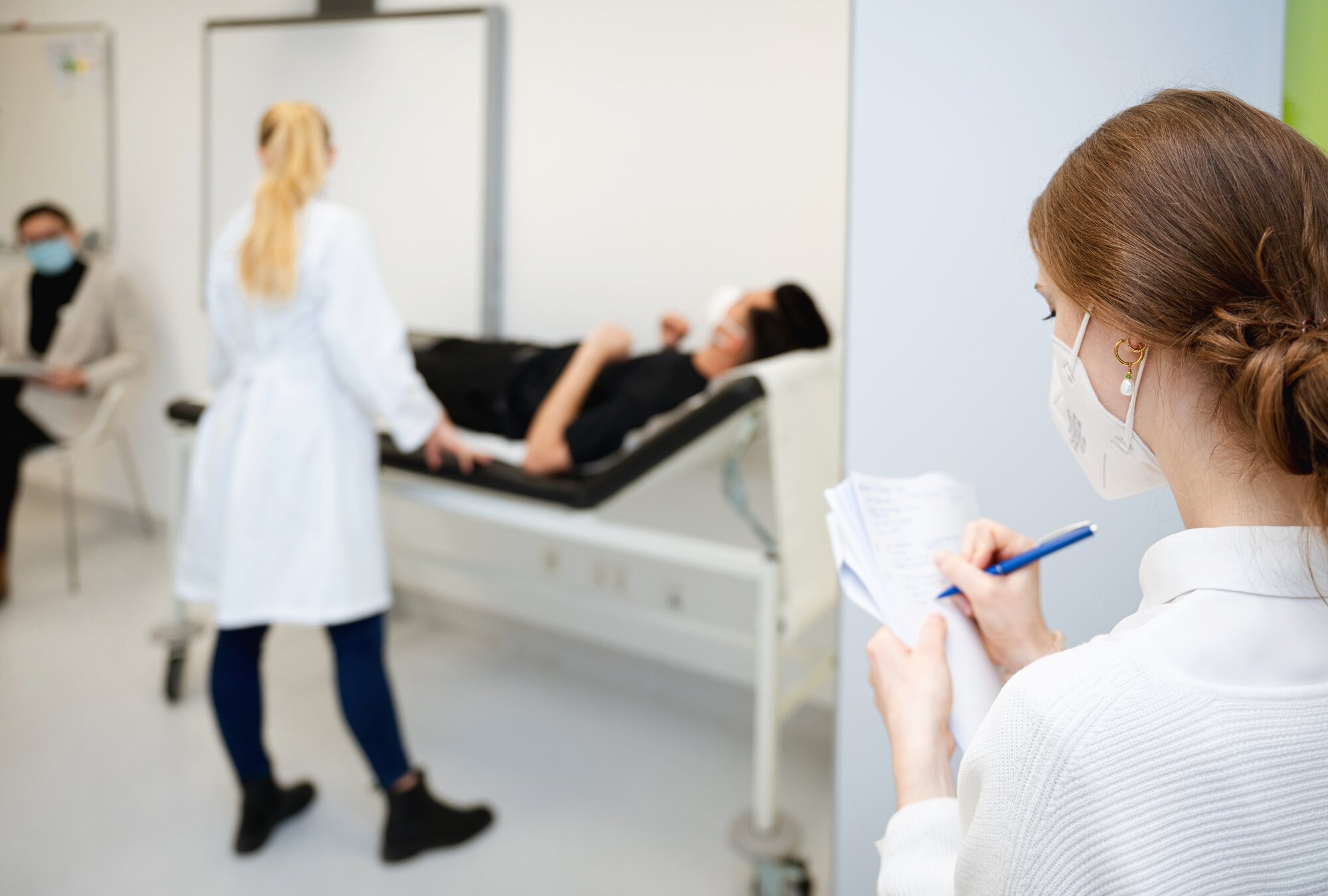 Ich bin Leonie Märtz, Pflegeschülerin im 2. Ausbildungsjahr und habe im Rahmen des PJ = Praktische Jahr für Studierende der Medizin eine Medizinische Fachangestellte gespielt. An meiner Station mussten die Prüflinge zusammen mit mir einen Behandlungsplan für einen sturzgefährdeten Patienten erstellen. Dabei mussten diese meinen Kenntnisstand berücksichtigen und die aufkommenden (geplanten) Unklarheiten verständlich und respektvoll beseitigen. Der Fokus dieser Station lag auf der interprofessionellen Kommunikation §. Mir hat meine Rolle sehr gut gefallen, da ich mit den Prüflingen direkt ins Gespräch gehen konnte. Zudem habe ich mich sehr wohl gefühlt, da fast alle Prüflinge nett und freundlich zu mir waren und tolle Gespräche zustande gekommen sind.